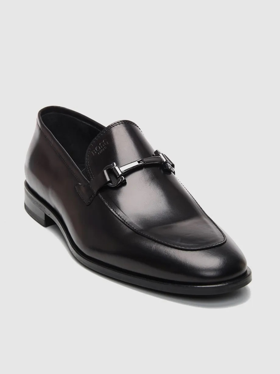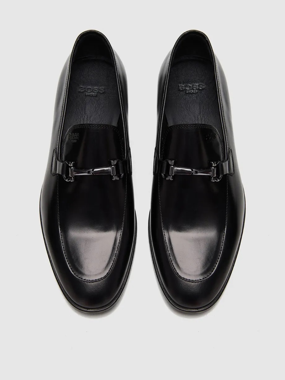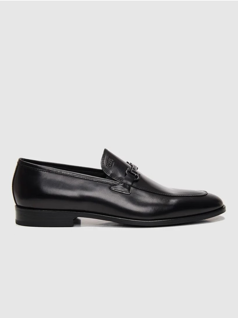 Μαύρα δερμάτινα loafers με ασημί τόκα της εταιρείας BOSS SHOES. Σόλα από δέρμα και λάστιχο για άνετο βάδισμα, ιδανικό για κάθε περίσταση.