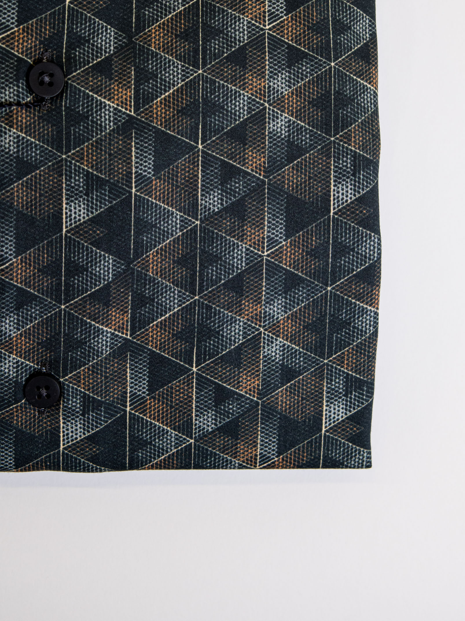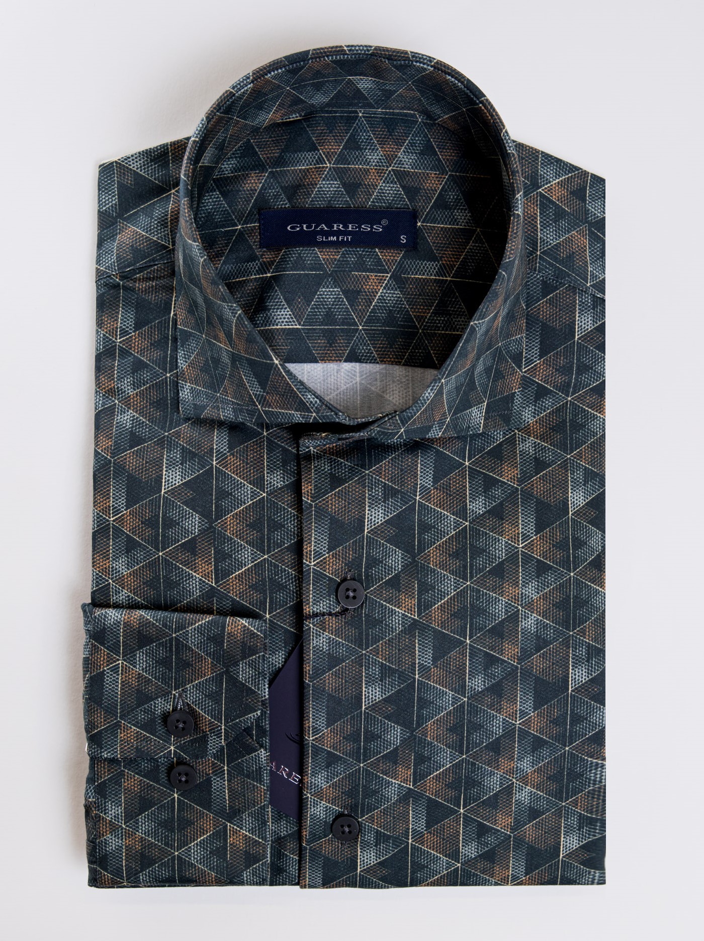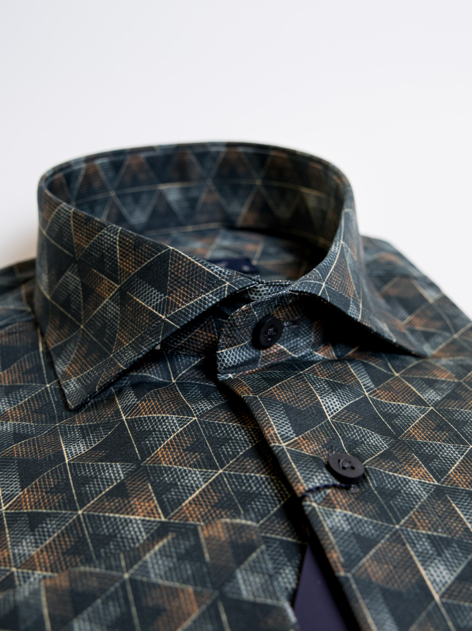 Μακρυμάνικο κυπαρισσί πουκάμισο με γεωμετρικά σχέδια,με rex γιακά σε στενή γραμμή.