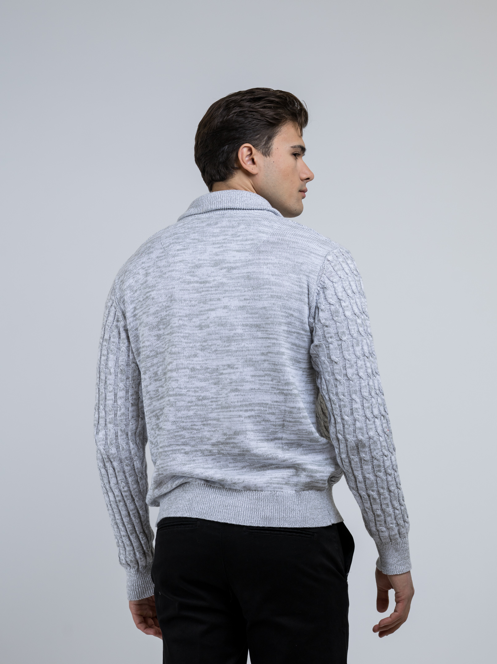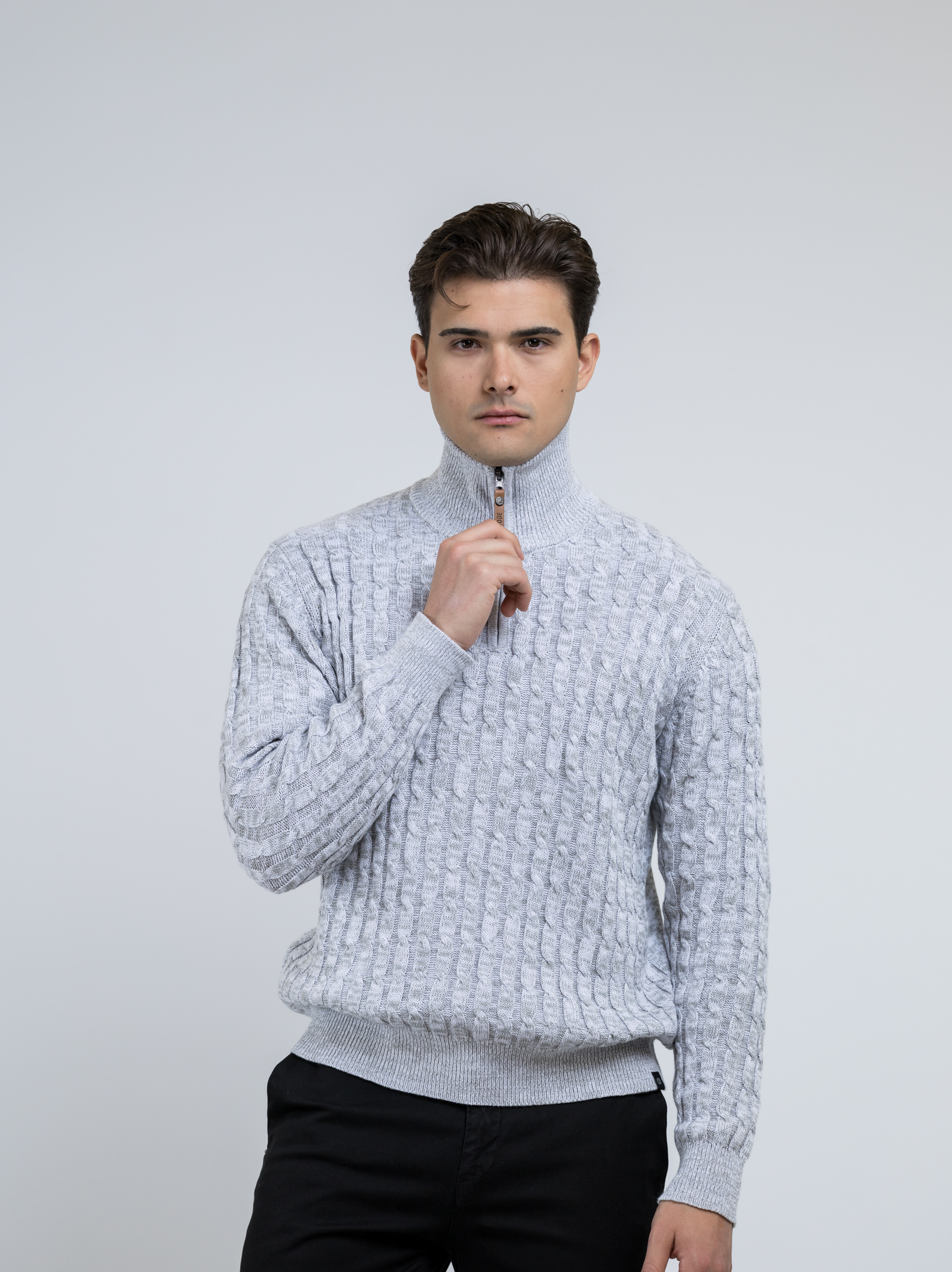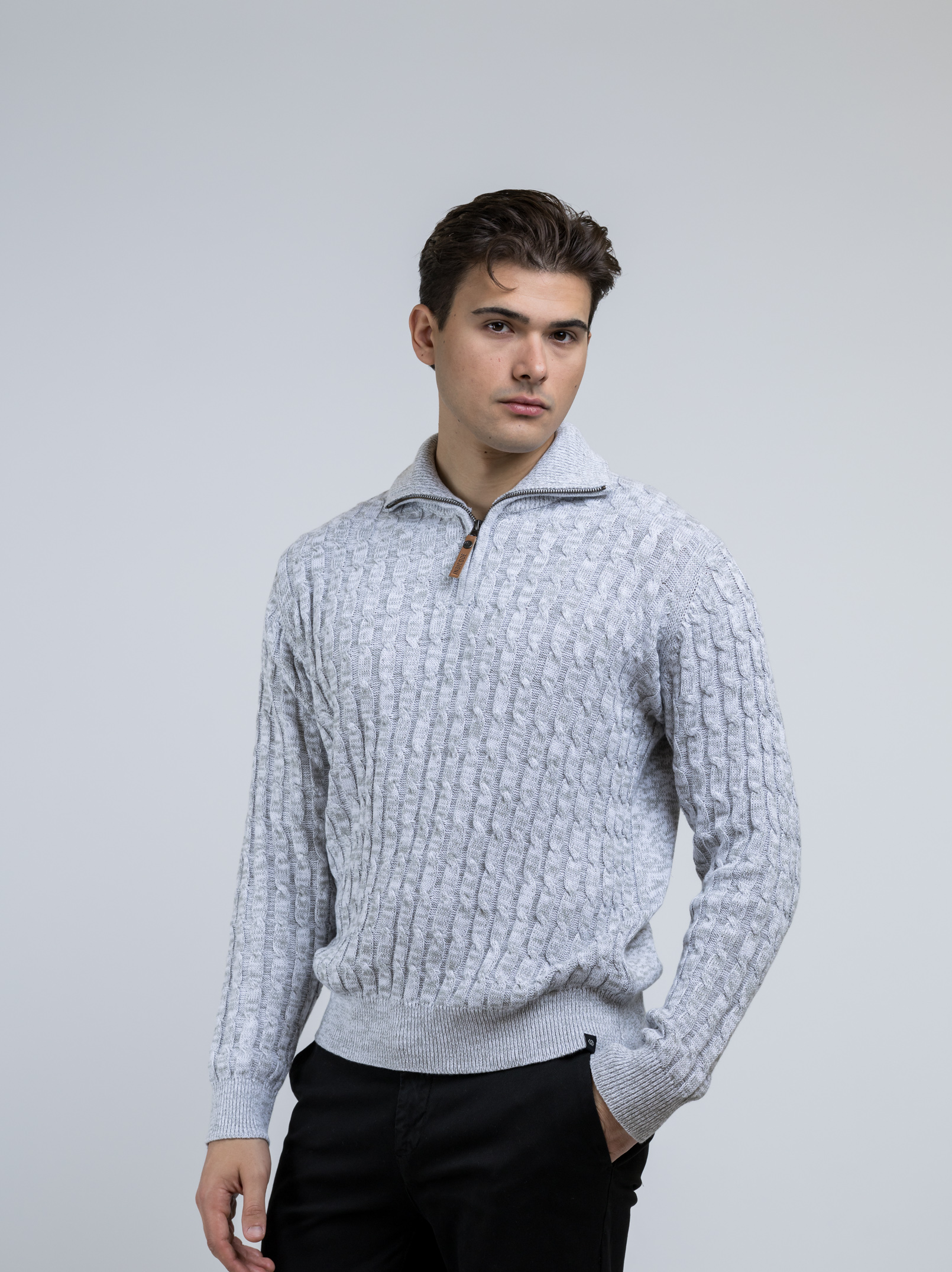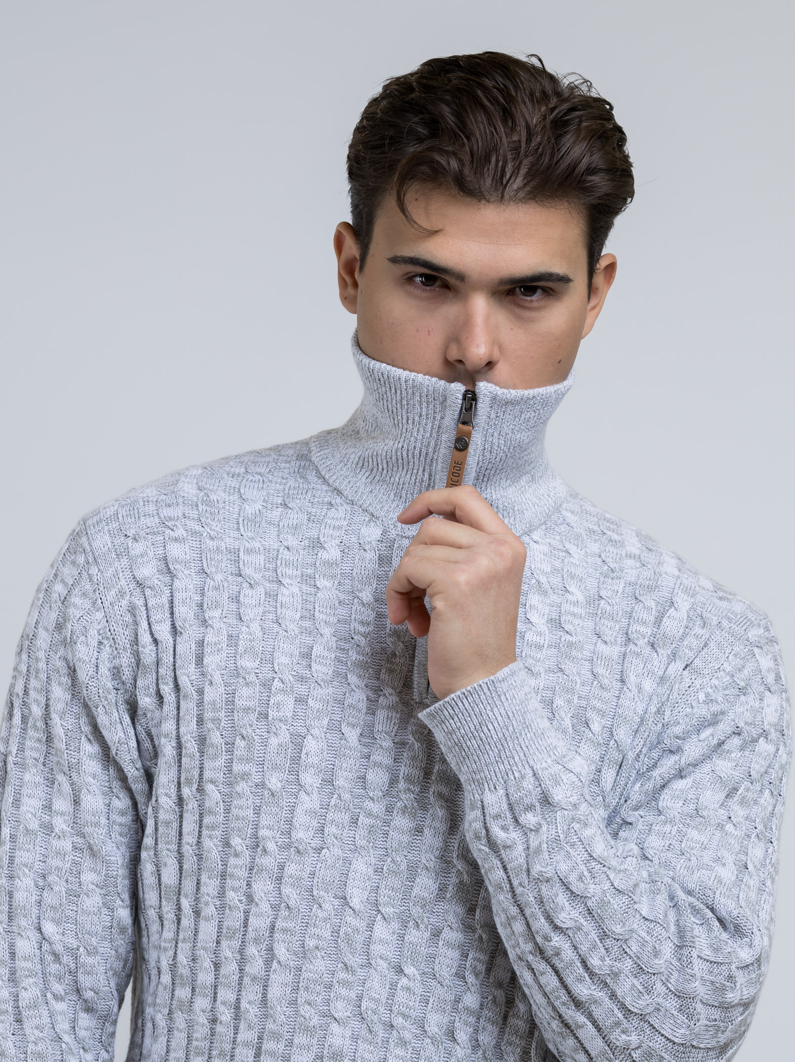 Γκρι πουλόβερ με σχέδιο πλεξούδα, με ψηλό γιακά και φερμουάρ της εταιρείας INDICODE.